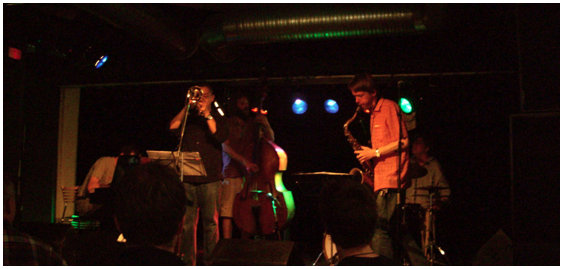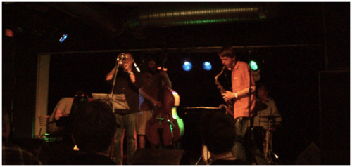 El tercer lugar que visitamos (al segundo lugar llegamos tarde por eso me lo brinco) fue un café para estudiantes en el que tocó un quinteto emergente (ver foto al inicio de este episodio). Tocaban bien, pero en algunos momentos me perdía en el ritmo; probablemente ya andaba medio pedo o no comprendo bien el jazz.