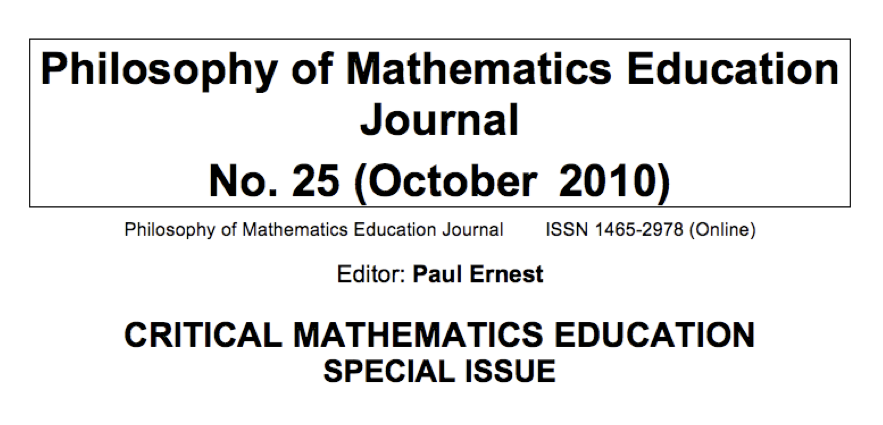 Hoy mi día comenzó muy bien: Recibí la notificación de Paul Ernest de que el artículo que escribí con Morten Blomhøj va a ser publicado muy pronto en un número especial sobre el tema de educación matemática crítica en la revista «Philosophy of Mathematics Education Journal».