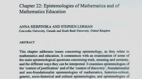 El día de hoy finalizó un curso de maestría en matemática educativa que diseñamos mis colegas Juan Gabriel Molina, Apolo Castañeda y yo. Fue un curso de epistemología titulado “Perspectivas epistemológicas de las matemáticas”. Uno de los recursos básicos del curso fue el capítulo de libro Sierpinska y Lerman (1996) llamado “Epistemologies of mathematics and of mathematics education”.