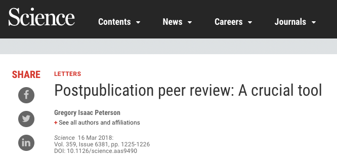 Peterson, G.I. (2018). Postpublication peer review: A crucial tool. Science, 359(6381), 1225–1226. http://doi.org/10.1126/science.aas9490